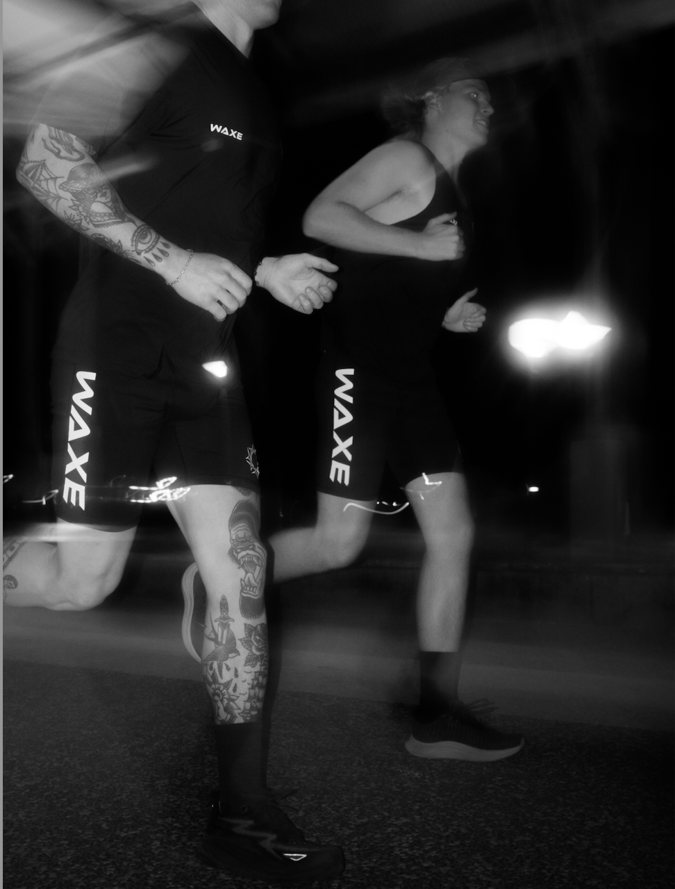 WAXE compression half tights, are designed to create a compressive force around large muscle groups responsible for force production in running.
